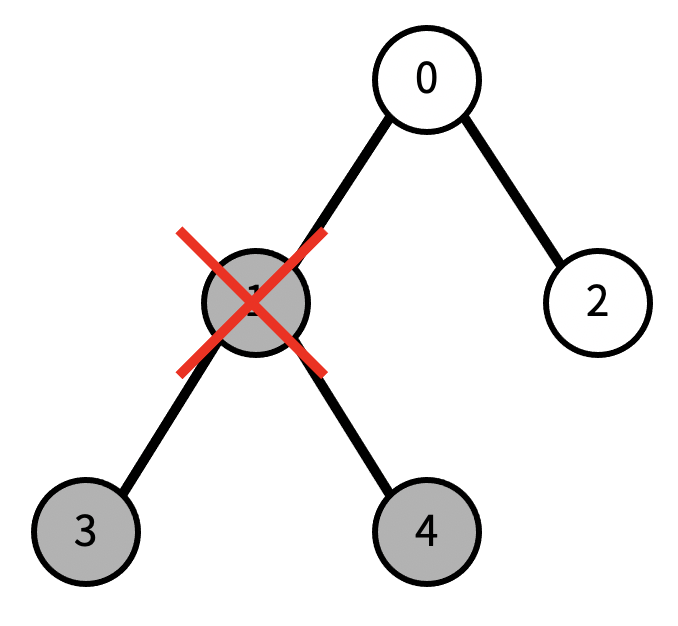 현재 리프 노드의 개수는 3개이다. (초록색 색칠된 노드) 이때, 1번을 지우면, 다음과 같이 변한다. 검정색으로 색칠된 노드가 트리에서 제거된 노드이다.