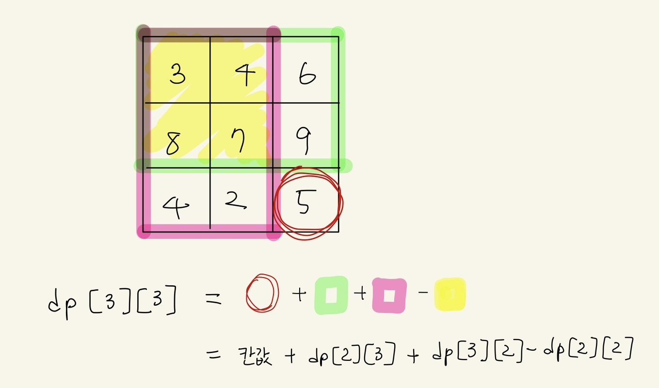 점화식은 dp[x][y] = 칸값 + dp[x-1][y] + dp[x][y-1] + dp[x-1][y-1] 로 계산했고, 이해를 위해서는 아래 그림으로!