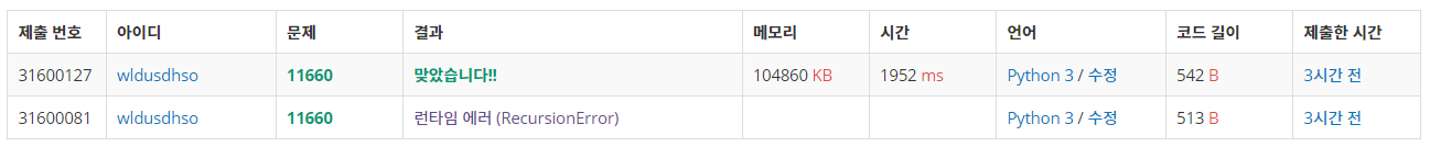 (dp 8일차) 이번 dp문제는 재귀로 구현해보았다. 반복문으로 어떻게 할지 모르겠어서 재귀로 했는데 역시 의미적으로 점화식 이해하기는 더 쉬운 것 같다. 런타임에러는 파이썬 재귀 최대 깊이를 넘어서 난 듯하다.